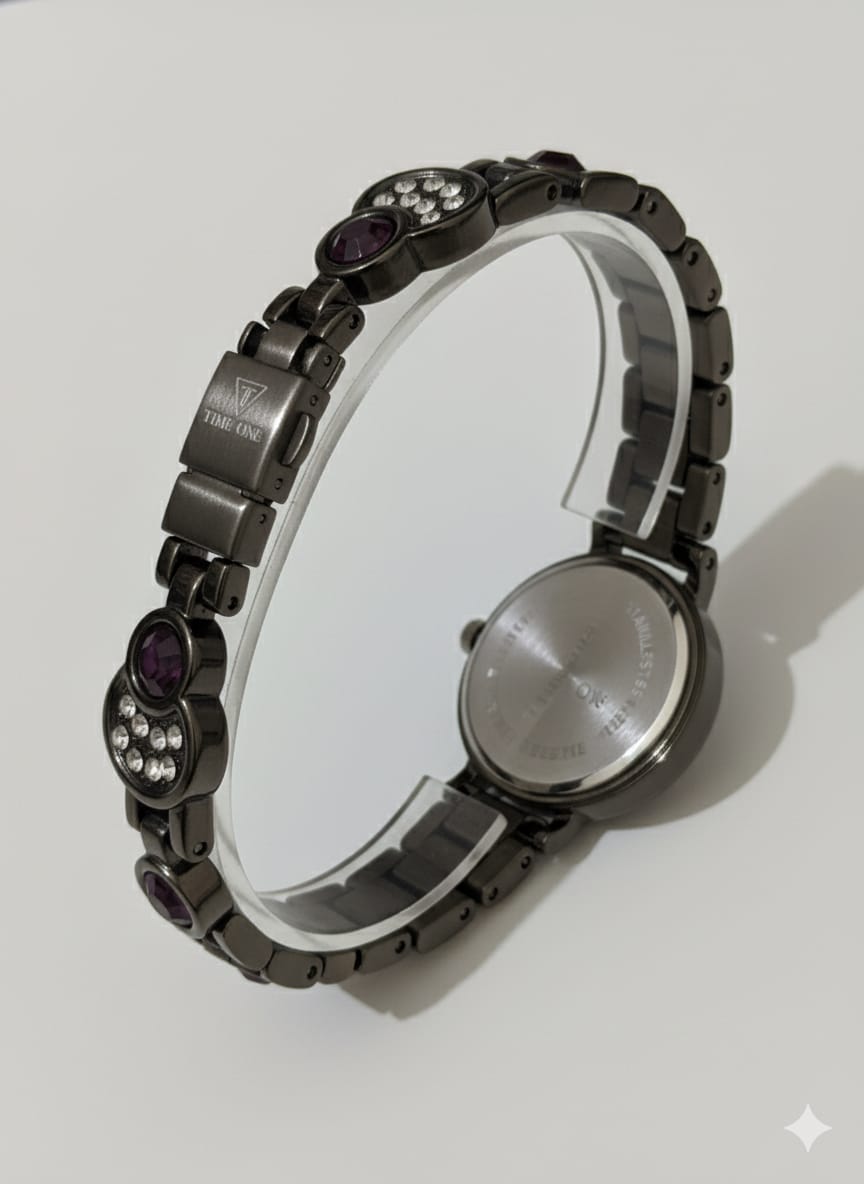 Add a royal touch to your wrist with the Elegant Purple Dial Crystal Studded Ladies Bracelet Watch from TIME ONE – MF Collections.