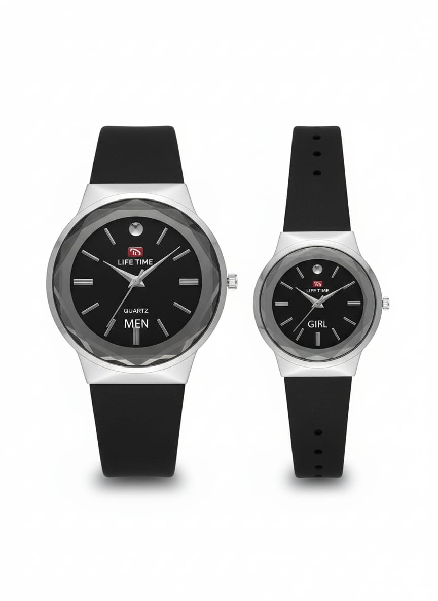 Celebrate timeless love and matching elegance with the Black & Silver Faceted Glass Couple’s Watch Set by MF Collections.